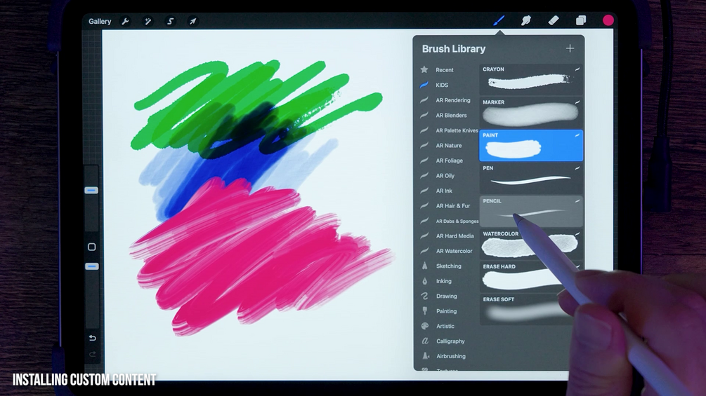 Included with the course are a set of brushes that will be easily recognizable to kids such as the Marker, Pencil, Crayon and more. These brushes have simplified controls to reduce mistakes and distractions, yet are powerful enough for professional illustration. For the best results, the Apple Pencil Pro is recommended, but the brushes will also work with finger painting.