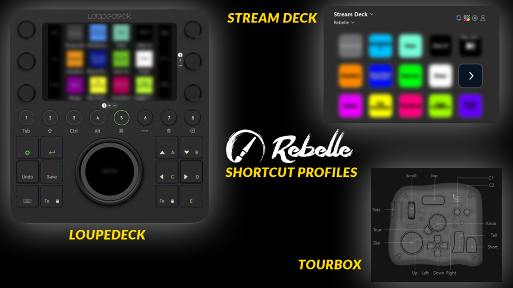 A collection of profiles you can use to install common shortcuts for Rebelle into your TourBox, Loupedeck or Stream Deck.
