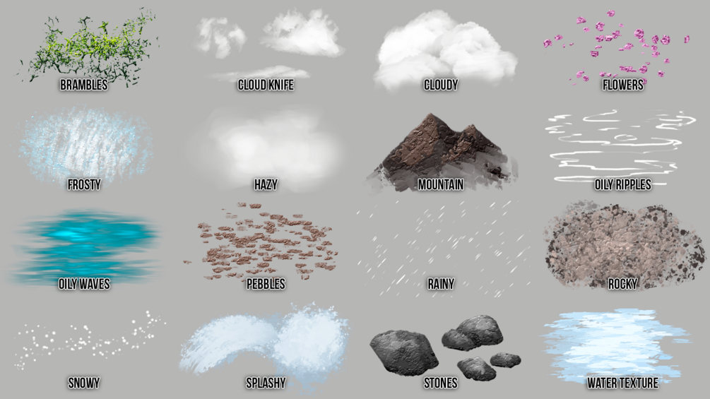 A collection of (139) premium brushes for Rebelle that you can use to create digital artwork in a variety of styles. These brushes produce traditional art effects like palette knives and inking, as well as landscape elements like leaves, mountains and water.